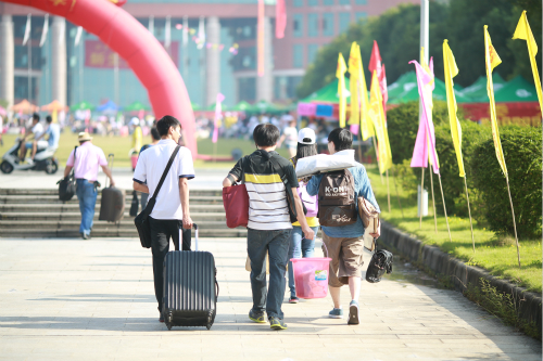 从车上下来的新生有的是几个人一起约好前来报道的,有的是在家长的陪同下一起前来的,在这样一群仰望着校门,脸上止不住欣喜的新生群中,记者注意到一个男生,独自一个人拉着行李箱,好奇的望着这个校门后面的一切,他就是小吴。