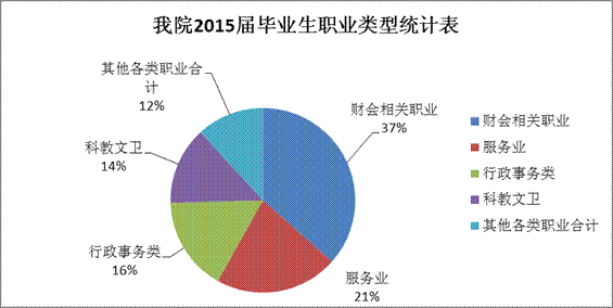 从职业类型分布来看,我们2015届毕业生的职业类型,比例最高的为财会相关职业,占36.55%;其次是服务业,占21.55%,再次是行政事务类,占16.47%,科教文卫类职业占 13.64%,其他各类职业合计11.79%.