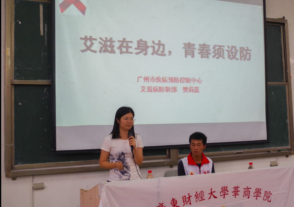 为了普及预防艾滋病知识,提高我们大学生对艾滋病危害性的认识,增强防御艾滋病和性传播疾病侵袭意识和技能,根据学院党委工作安排,由学院团委主办、院红十字会学生分会承办的“携手防艾,红丝传爱”艾滋病预防知识讲座于2016年10月18日星期二下午15:00在励志楼C308教室顺利举行。出席本次讲座的有学院团委刘苗副书记、陈刚副书记、增城区疾病预防控制中心慢性传染性疾病预防控制科刘烈茜副科长、学院团委老师、院红十字会学生分会指导老师黄剑年等。本次讲座由广州疾病预防控制中心艾滋病防制部樊莉蕊医生主讲。