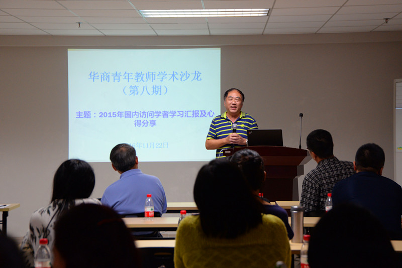 吴玲老师汇报了自己在访学期间获到的成绩与心得,表示经过一年的访学进修,拓宽了自身的知识面,特别是在科研能力上得到很大提升。她还表示,只要有梦想并坚持下去,最后总会成功的。钟晶灵老师围绕“应用型有心人发展之路”展开访学汇报。他表示,教师要做一个“有心人”,要把研究成果灵活地运用到教学当中。张百珍老师在访学期间阅读了许多专业文献、参加了博士讨论会与前沿学术讲座、参与多个课题研究,提升了科研能力。张洪浩老师也分享了自己在访学期间的学习心得。在互动交流环节,教师踊跃发言,与四位老师进行了很好的互动。