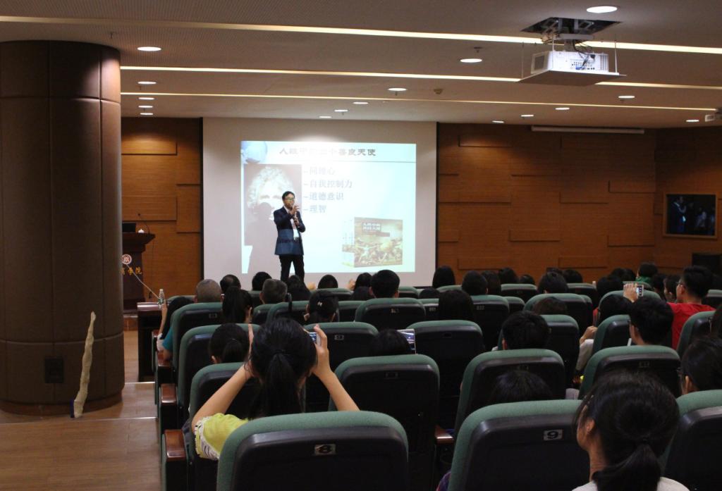 彭教授一边通过生动的演讲,一边给师生们播放相关视频,时而用自由联想的方式与师生们互动,通过猜出教授随机写下的词语与诗词,启示师生们:人是有同理心的,可以设身处地,换位思考,所以我们能感受生命中人性的美好,看到希望会产生喜悦,看到不幸会产生悲悯,这是人类不断进化的福流。他倡导师生们培养慧眼禅心,善于观察周边细小的东西,不要因为过分专注而视而不见。养心比养身更重要,主张多读书,多思考,常做运动,分担家务,帮助别人成长,与人为善等方式达到知行合一的修心,让自己活得快乐与福流。