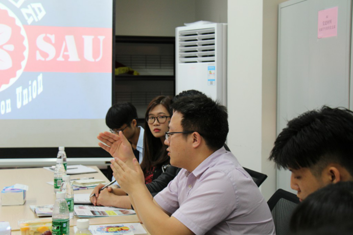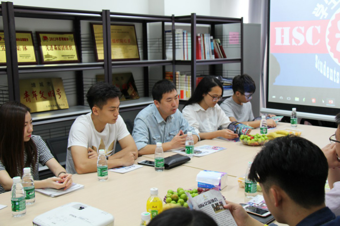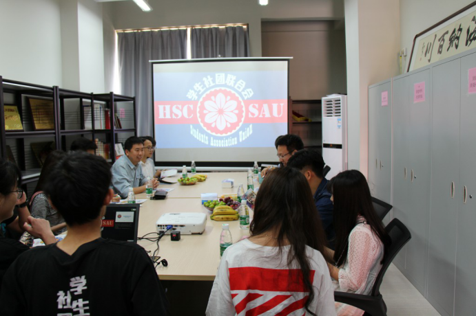 我们社联负责人为来宾播放了我们社团建设的介绍视频,接着通过PPT讲解《怎样做好校园公众号》,努力打造好网络宣传阵地。两校学生代表随后进行深入交流学习,在社团管理上进行探讨并交换了意见。