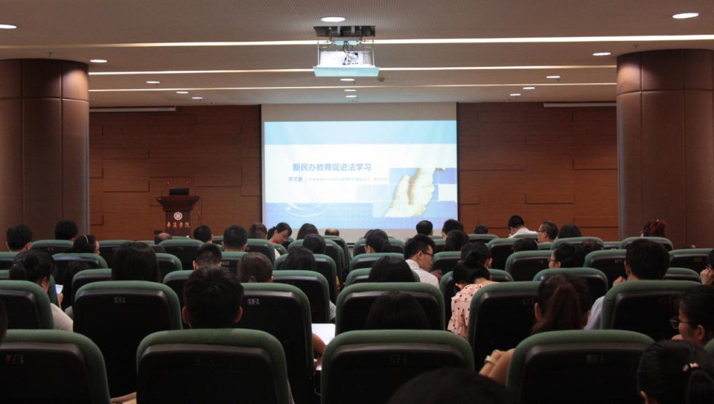 为正确把握新时期国家民办教育改革发展新方向,深刻理解民办教育新法新规精神内涵,我们特邀请了广东省教育研究院民办教育研究室李文章副主任前来作“新民办教育促进法学习”讲座。讲座于6月13日下午3时在我们图书馆报告厅成功开展。出席讲座的领导有党委苏宁书记、龙少锋副院长、王锦秀副院长。全体行政教辅人员、辅导员参加了本次讲座。讲座由龙少锋副院长主持。