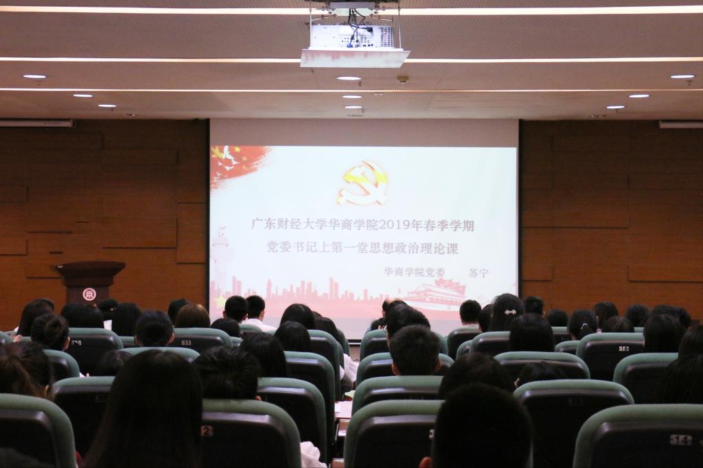 为落实好广东省教育厅《关于做好2019年春季学期高校党委书记、校长和院(系)党组织书记、院长(系主任)上第一堂思想政治理论课工作的通知》(粤教思函[2019]10号文件)精神,认真学习贯彻落实习近平新时代中国特色社会主义思想和党的十九大会议精神,引导学生正确认识世界和中国发展大势,进一步加深对校园的认识和了解,4月2日,学校党委苏宁书记在图书馆报告厅为我们各二级院系团员代表、青马班学员、团校学习班学员开讲2019年春季学期思政第一课。