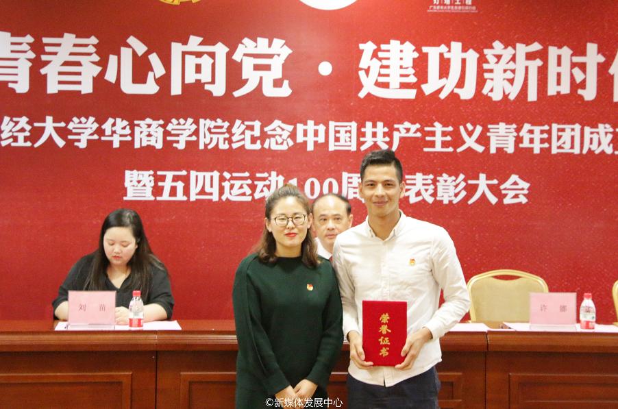 校团委刘苗副书记为获得广州市增城区2018年度优秀共青团干部的罗坤贤同志,获得广州市增城区2018年度优秀共青团员的李建兴、何沫函、冯燕羽颁奖。