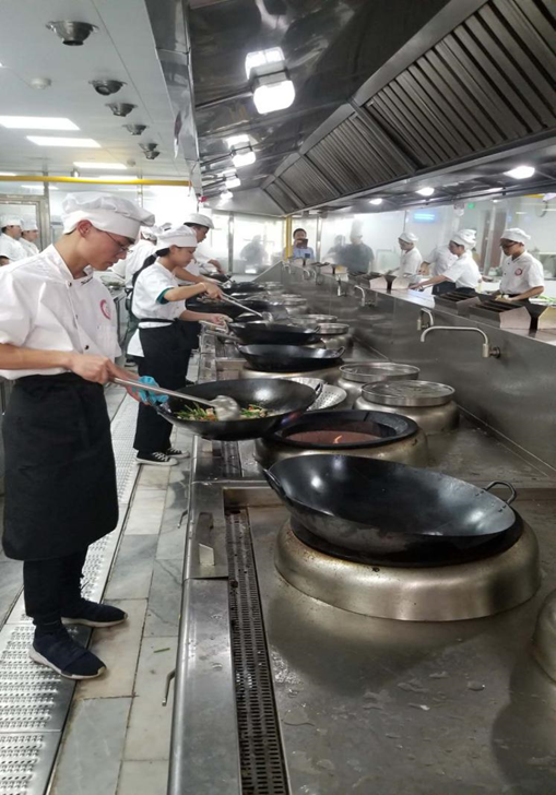 27日上午,港澳青年代表团兴趣盎然地参观了国务院侨办设于华商职业学院的“中餐繁荣基地”和增城区大力推进的“粤菜师傅学堂”。这里有专业烹饪教师和精良烹饪设备,可以为港澳青年在粤菜及饮食方面实习、就业、创业等提供帮助。代表团对中餐繁荣基地合理有致的布置,180°落地玻璃厨房以及先进齐全的设备表示赞叹,对这里的“粤菜师傅学堂”以及所开设的“南华厨艺•青年粤菜师傅培养工程”产生非常浓厚的兴趣,并向相关老师了解了更多关于该工程的信息以及培训的内容。