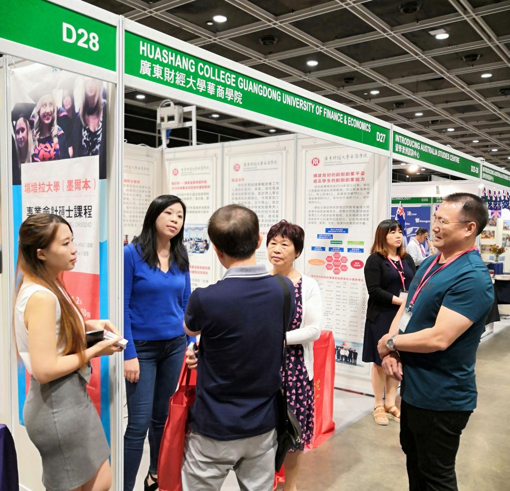 广东财经大学华商学院副董事长兼总裁、副校长廖伊曼率队参加了本次教育及就业展,学校领导,毕业生就业指导中心主任曾龙威、主任科员刘丽丽,港澳台侨招生办主任黄伟新,集团旗下澳洲国际商学院(GBCA)代表参加了开幕式和为期两天的教育展活动。