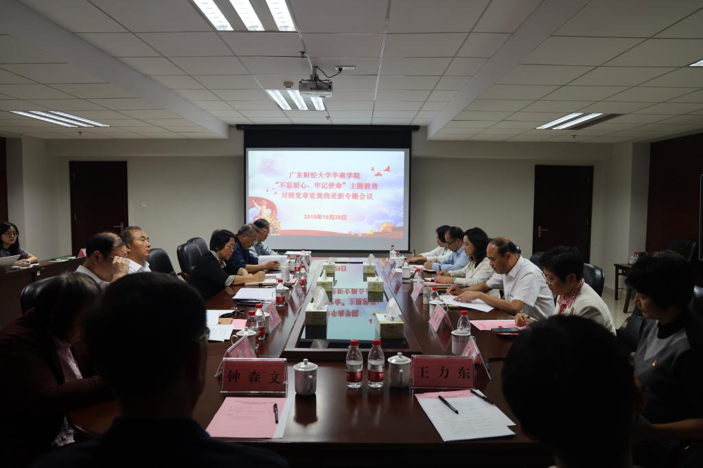 为进一步把党章党规学深悟透,加强党员干部的理论基础建设,按照“不忘初心、牢记使命”主题教育部署安排,10月29日,我们召开领导班子对照党章党规找差距专题会议。省委教育工委第四指导组成员到会监督指导,广东财经大学华商学院“不忘初心、牢记使命”主题教育领导小组全体成员、全体校领导班子出席了本次会议,并对照党章党规查找自身差距,明确整改方向和措施。