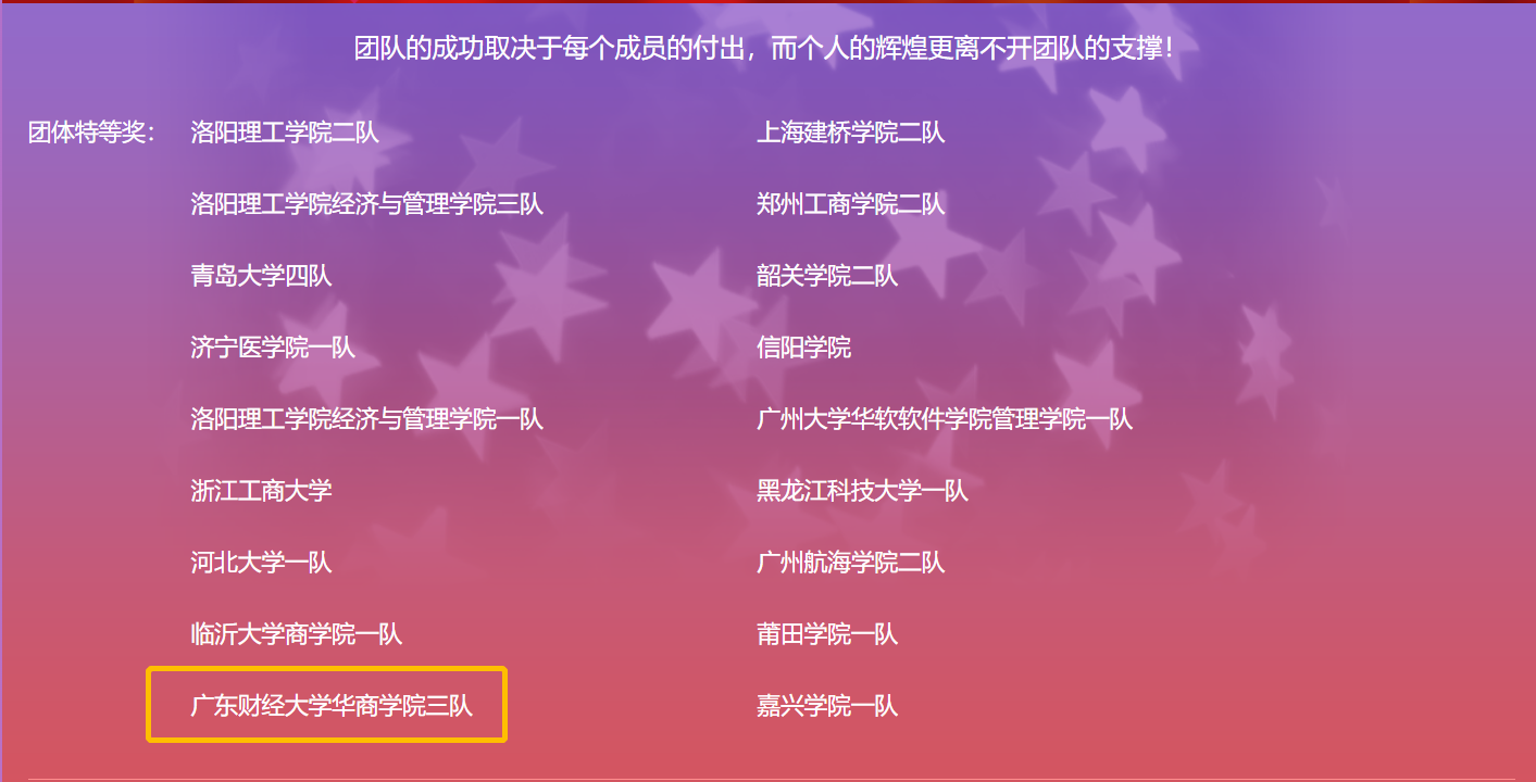 我们经济与金融系高度重视本次比赛,专门成立了指导老师团队,对9名参赛选手在赛前进行了精心的辅导。本次比赛受到疫情影响,指导老师和九名参赛队员通过线上的腾讯会议和微信进行不间断的指导和交流。在整个比赛过程中,各参赛队员通力协作、不怕辛苦、顽强拼搏,表现出了昂扬的斗志和锐意进取的精神状态。