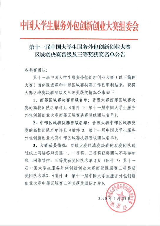 近日,第十一届中国大学生服务外包创新创业大赛组委会公布初赛成绩。本届大赛共吸引了来自全国651所院校的6417支团队报名,在我们师生的共同努力下,“快乐就完事”和“今晚不熬夜1”团队晋级中部区域赛决赛,角逐一、二等奖,“超级云课堂”团队获得中部区域赛三等奖。