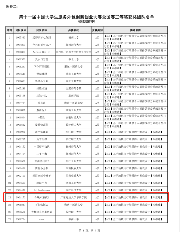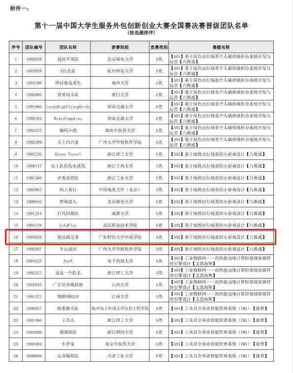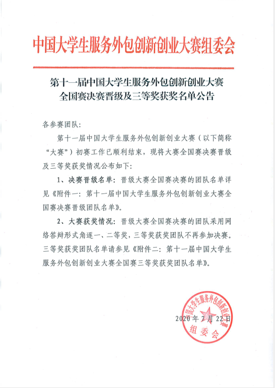 近日,第十一届中国大学生服务外包创新创业大赛组委会公布全国赛决赛晋级及三等奖获奖名单公告,我们有两支队伍再创佳绩,“快乐就完事”成功晋级全国总决赛角逐一、二等奖,“今晚不熬夜1”队获得全国赛三等奖。