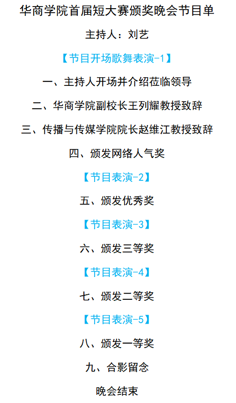 本网讯华商学院首届短视频大赛颁奖晚会将于9月23日晚7时隆重举行。华商学院“首届短视频大赛”正式落下帷幕,为表彰华商首届短视频大赛获奖学生,进一步提升学生专业实践积极性,由华商学院主办、教务处和传播与传媒学院共同承办的华商学院首届短视频大赛颁奖晚会将于9月23日(周三)晚7时在华商学院图书馆报告厅隆重举行,届时,将揭晓本次大赛各奖项获奖作品,同时,还有精彩的文艺演出贯穿其中。华商学院校领导代表、教务处领导代表、传播与传媒学院领导及各系主任、教职工代表将出席本次活动。传播与传媒新媒体中心将对本次晚会进行网络视频转播和图文直播。