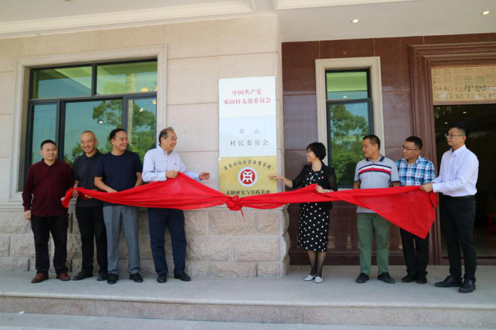 为响应广州市委、市政府关于实施乡村振兴战略的号召,围绕增城区小楼镇邓山村打造名村的目标,加深对社会主义新农村建设的感受与理解,同时为人文学部学生提供更广阔的实践平台,在广东财经大学华商学院副校长、人文学部主任王列耀教授的带领下,经多次考察与协商洽谈,我们与小楼镇相关工作人员、邓山村村委达成了交流与合作的共识,决定建立我们与邓山村的文创研究与实践基地。2020年10月12日上午11时,广东财经大学华商学院与邓山村合作的“文创研究与实践基地”揭牌仪式在邓山村村委会举行。