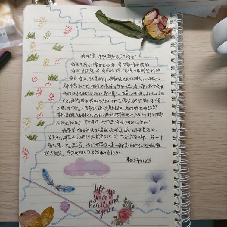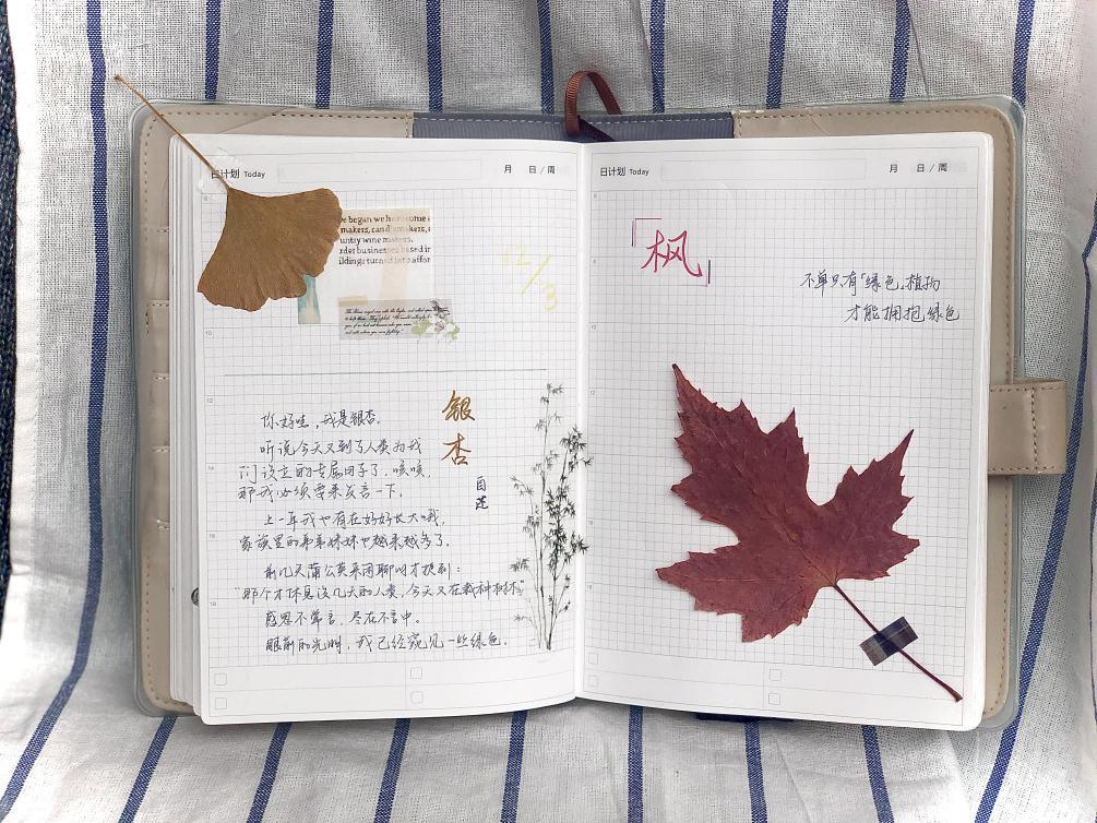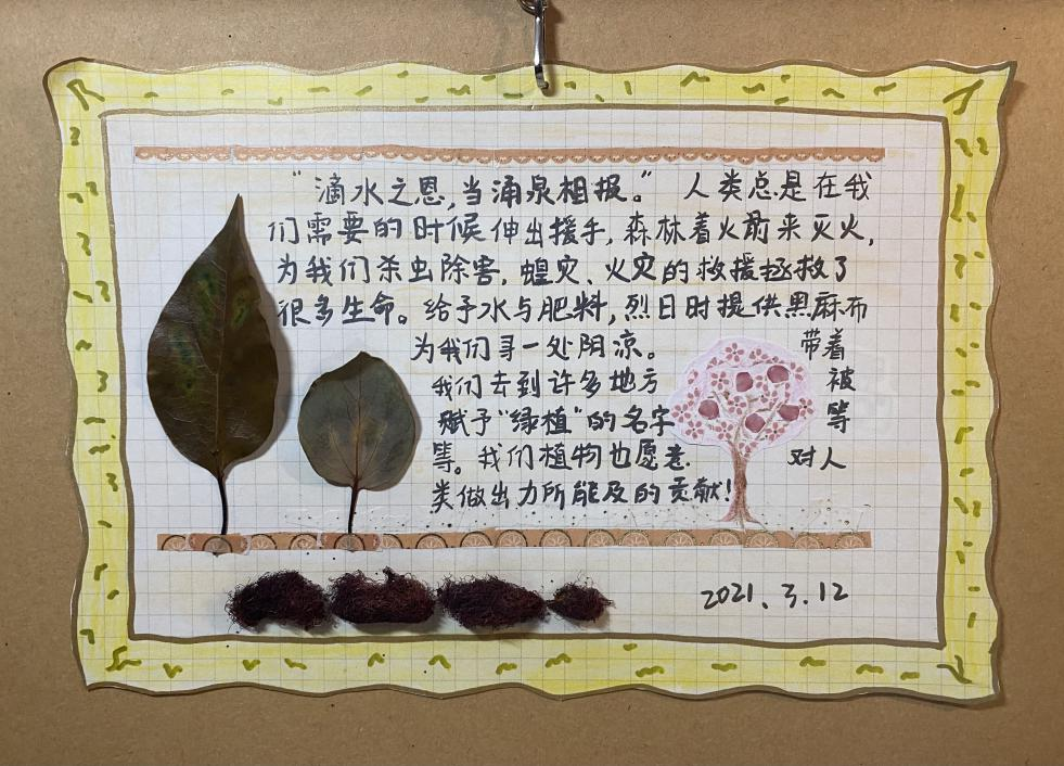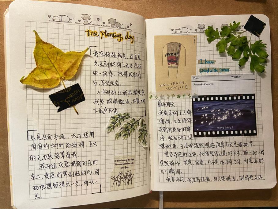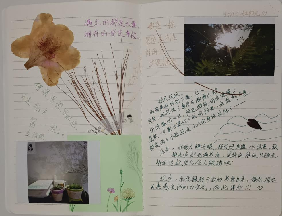 在此次活动,参与的同学可以通过两种形式参与,既可将飘零在草地上的花朵制作为标本通过图片形式也可在网上照片中选择植物图片,并上设计理念,图文并茂,最终以手账形式提交。