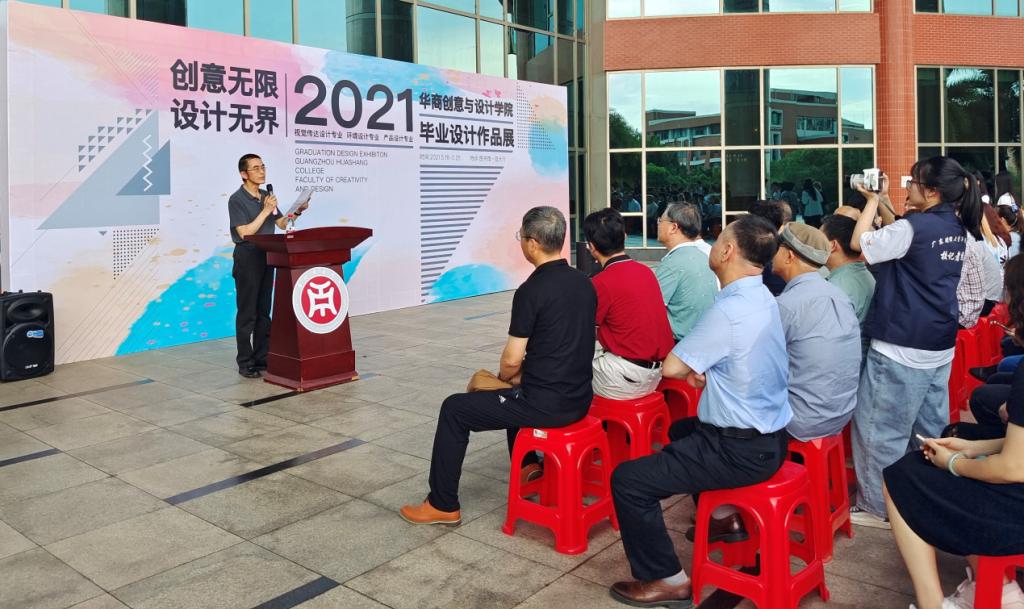 创意与设计学院常务副院长祝东平教授讲话。他提出,创意无限,设计无界。毕业设计展,是学校建立以提高实践能力为引领的创新型研究与应用人才培养流程;是建立产教融合、协同育人的人才培养模式,实现专业链与产业链、课程内容与职业标准、教学过程与生产过程对接办学宗旨的回应,也是对教师们辛勤耕耘的感恩;它既是学子们大学阶段学习的终点,也是步入人生下一阶段的起点。最后,祝院长祝愿2021届毕业生在火热的青春中放飞梦想,成就美好人生。