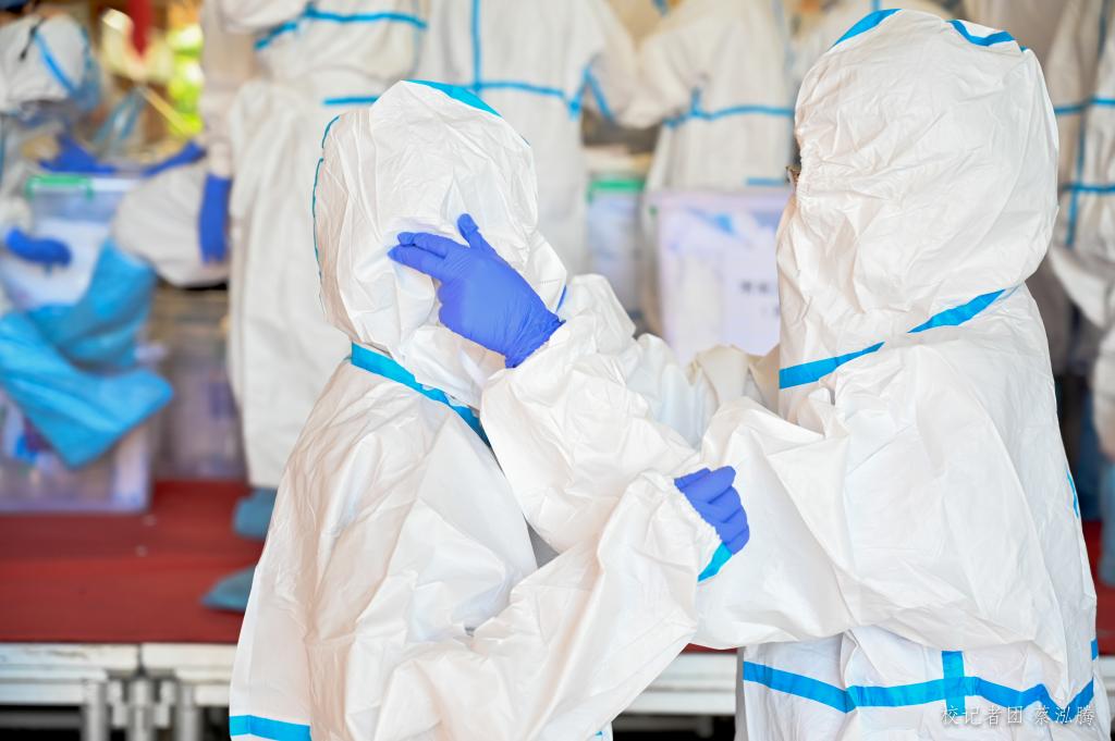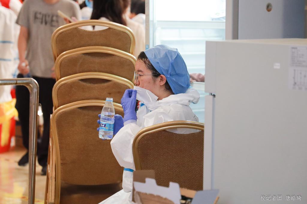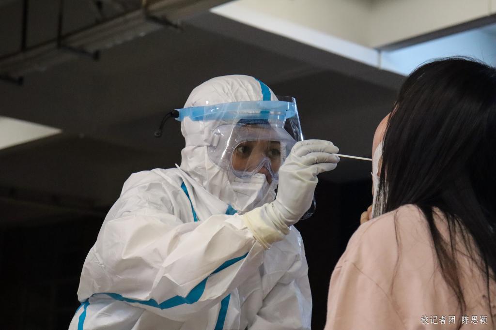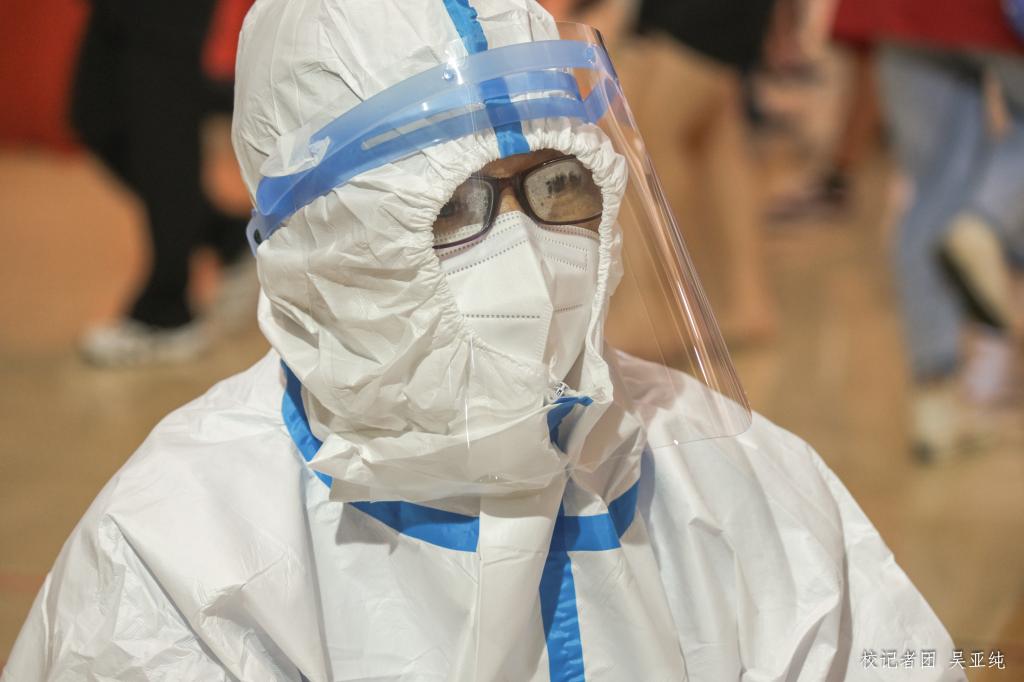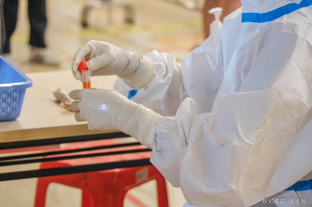 核酸检测采样点现场分为排队等候区、体温检测与信息采集区,及核酸检测区三大区域。志愿者及安保人员认真维持现场秩序,为前来检测的人员测量体温、指引信息登记,积极投入疫情防控工作,全力配合做好校园核酸检测工作。