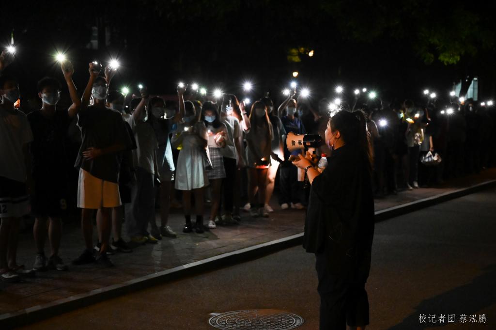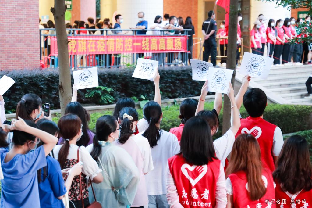 在核酸检测工作进行期间,我们学子自发组织,手举红旗为医护人员献唱、亮起灯光喊响“广州加油!白衣天使谢谢你!”的口号为医护人员送别,以此表达对本次抗疫的决心及对白衣天使们的感激之情。