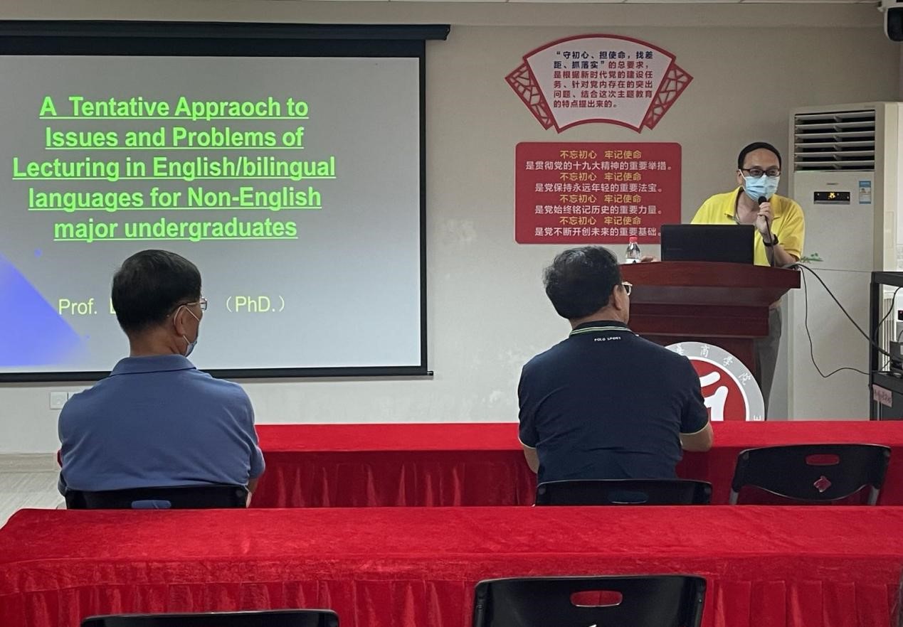 本次讲座的主题为:“非英语专业本科生英语/双语教学问题初探”。黎平海教授分别从学生、课本及教师三个角度剖析了双语教学过程中存在的问题,并分享了相应的解决方案。在讲座的互动环节,黎平海教授与教师们就双语教学方面的问题展开了热烈的讨论,教师们各抒己见。黎平海也教授解答了教师们的问题。