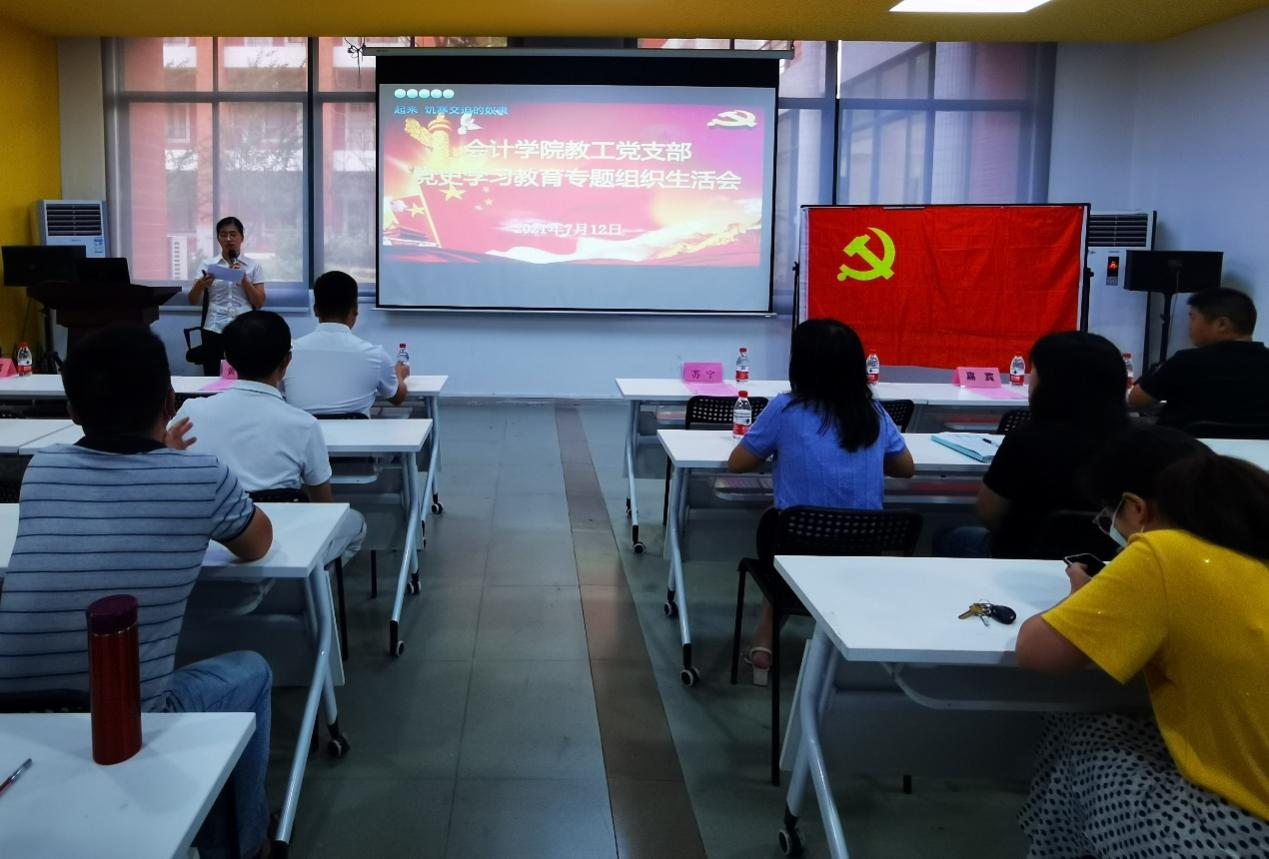 根据学校党史学习教育领导小组关于召开党史学习教育专题组织生活会的总体安排,7月12日上午,会计学院教工党支部召开党史学习教育专题组织生活会,校党委书记苏宁同志列席指导。会计学院党总支副书记陈洋广同志,以及会计学院各基层党组织书记列席了组织生活会。