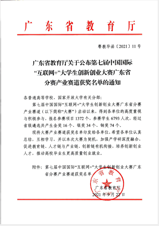 近日,广东省教育厅公布的第七届中国国际“互联网+”大学生创新创业大赛广东省分赛产业命题赛道获奖名单中,新伟德国际1946《数字经济创新商业模式设计》项目获省赛银奖,《AI+ 智慧交通—— 城市智慧交通解决方案》和《乡村旅游直播》两个项目获省赛铜奖,获奖总数在全省民办本科高校中居于首位。