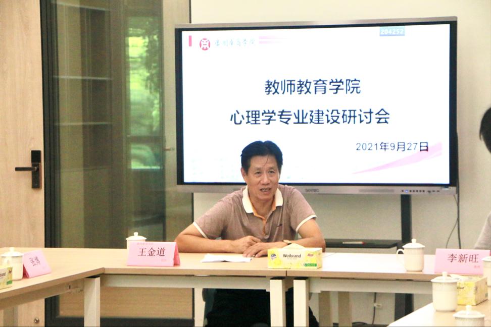 首先,王金道院长代表教师教育学院对李新旺教授的到来表示热烈的欢迎和衷心的感谢。王金道院长就学前教育专业和小学教育专业的办学历史、现状和成绩做了总结和汇报。教师教育学院前身为教育系,成立于2018年4月,教育学为校内重点学科。现设有学前教育系、小学教育系、基础理论教学部、教师技能培训中心。小学教育专业在各级领导和专家的大力支持下申办成功。王院长还介绍了教师教育学院的师资队伍,我们的师资队伍在同类院校中是较有优势的。王院长表示我们很有信心申报、开设好心理学专业,学院现已着手准备申报材料和建设好各方面的基础。