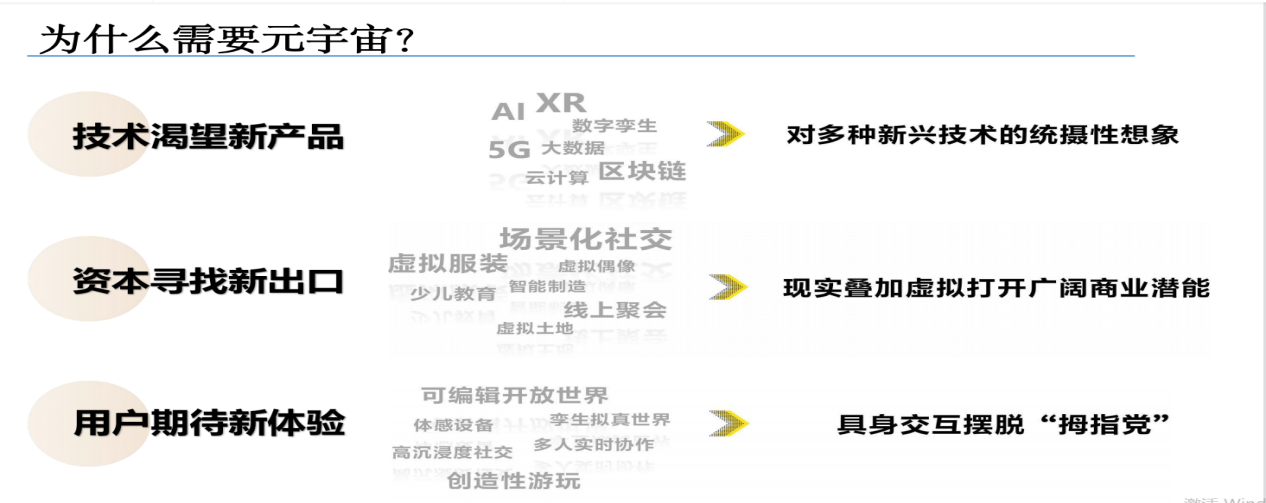 元宇宙本身不是一种技术,而是一种理念和概念,它基于VR、AR、5G、6G和人工智能、大数据等新技术的发展。我们现在强调虚实相融,但最终还是会走向更加虚拟化,还是能够反哺于现实社会,主要看VR还是AR这两种技术路线,哪一种技术路线发展得更加迅捷。