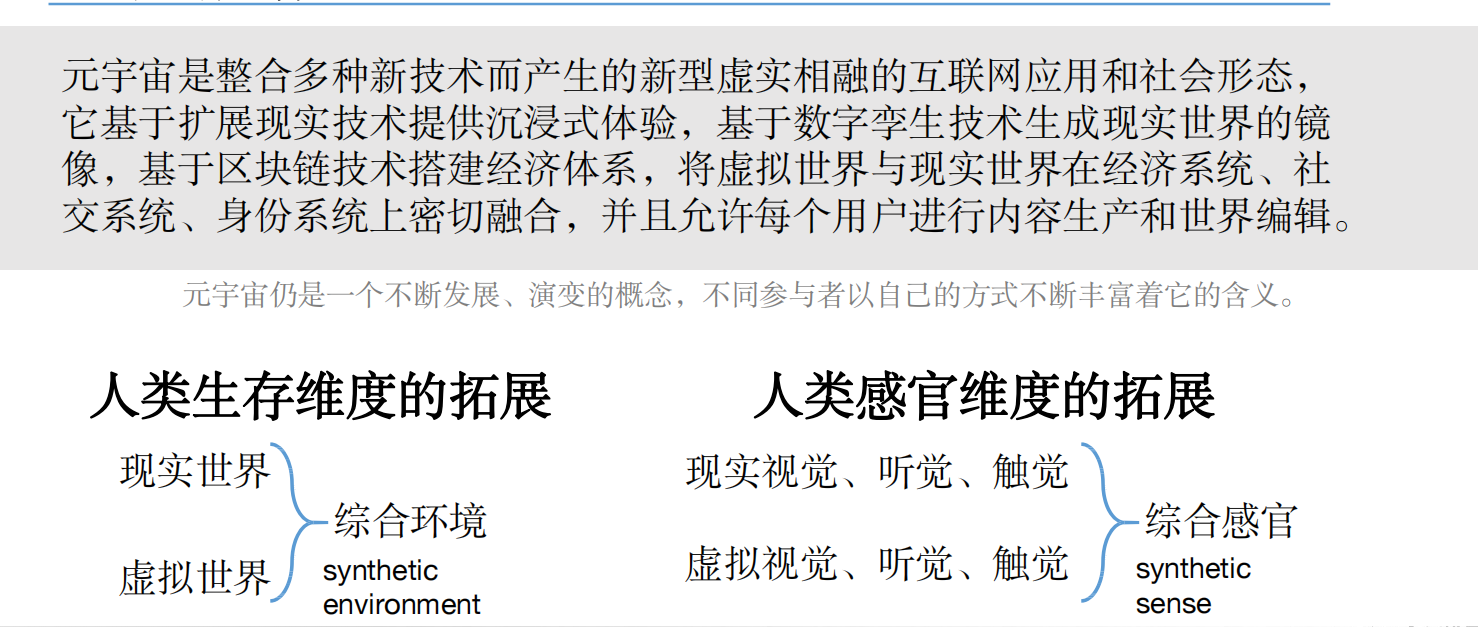 那么,元宇宙究竟是什么概念呢?简单来讲,元宇宙是一个平行于现实世界,又独立于现实世界的虚拟空间,是映射现实世界的在线虚拟世界,是越来越真实的数字虚拟世界。综合来讲,元宇宙是整合多种新技术而产生的新型虚实相互融合的互联网应用和社会形态。