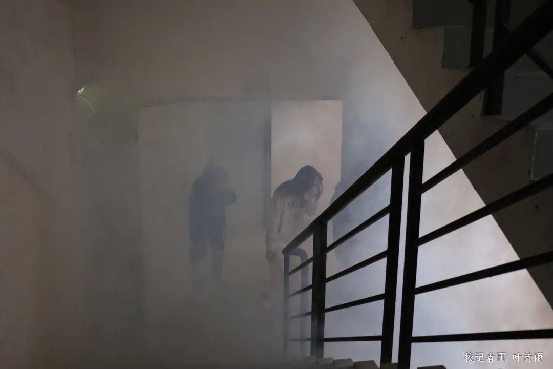 师生在疏散引导员的指引下,用湿毛巾捂住口鼻,低姿前行,按照指定疏散路线,有序撤离着火点,快速抵达安全地带。