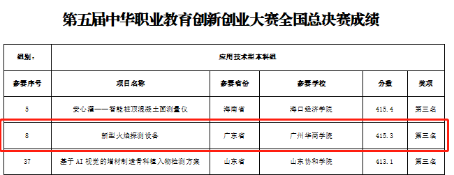 12月28日-30日,第五届中华职业教育创新创业大赛决赛在线上举行。本次大赛由中华职业教育社主办,广西壮族自治区党委统战部、广西中华职业教育社、广西壮族自治区人力资源和社会保障厅等承办。经过激烈角逐,我们《新型火焰探测设备》项目团队代表广东省参赛获得应用技术型本科组全国第三名。
