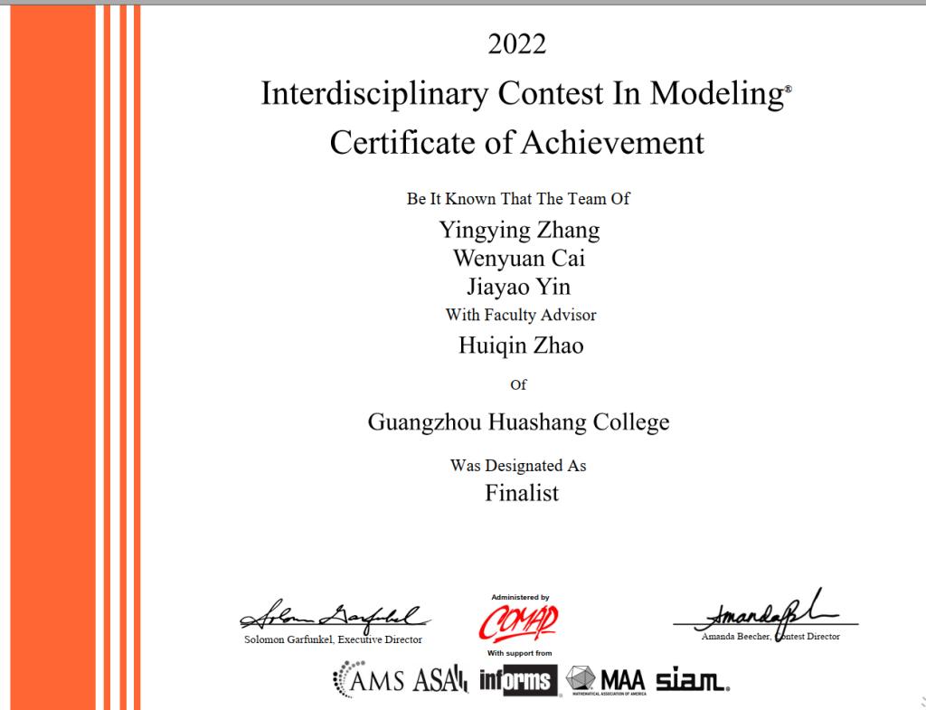 由我们经济贸易学院的赵慧琴老师指导、金融学院19级经济与金融专业张盈盈同学、经济贸易学院19级国际商务班蔡文渊同学及数据科学学院19级计算机科学与技术专业尹家耀同学组成的参赛队伍,在学校和学院的支持下,于今年2月18日-22日期间参加美国大学生数学建模竞赛,获得F奖(特等奖提名)。这是目前我们在该项比赛中获得的最好成绩。