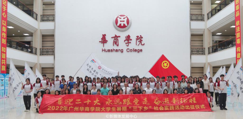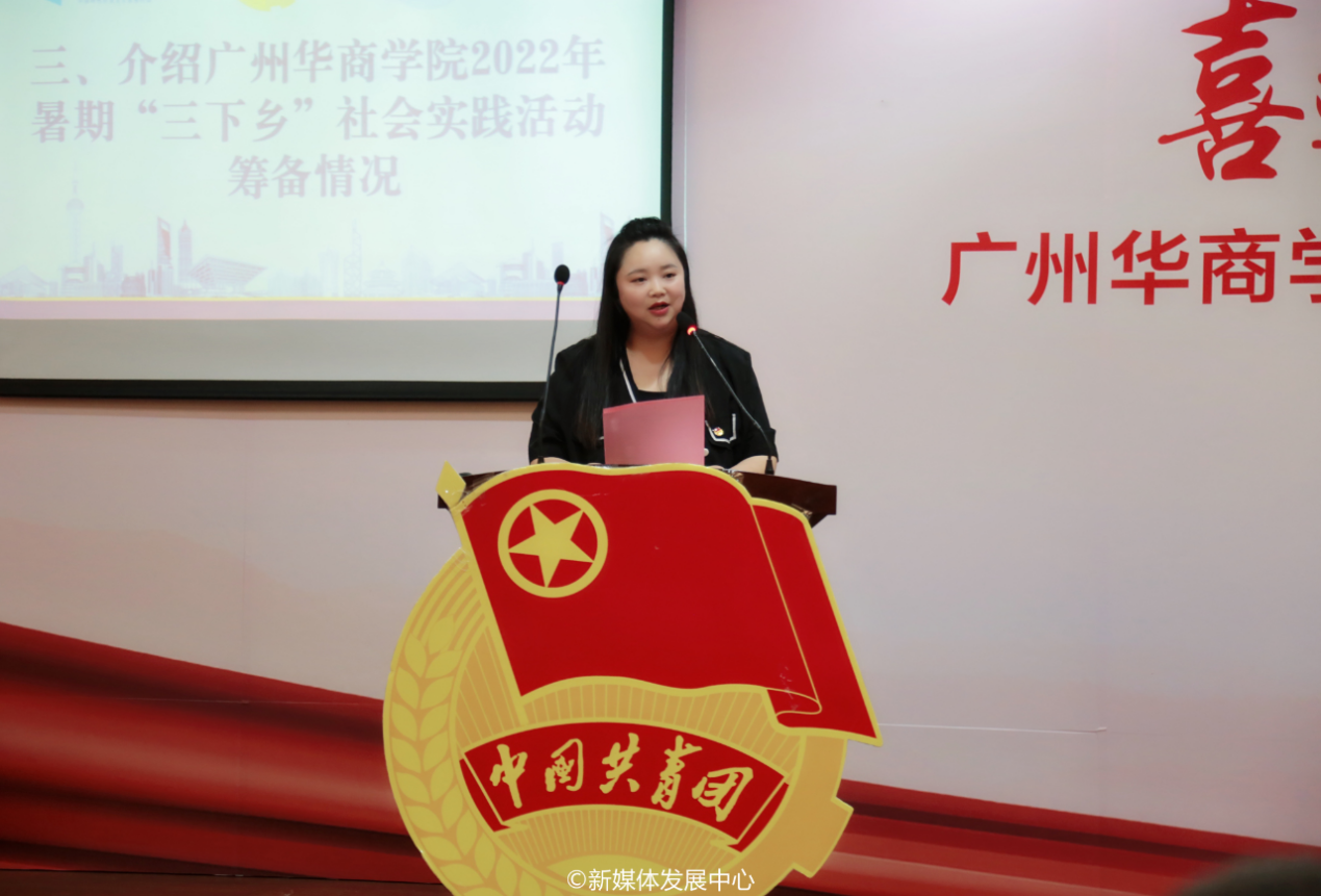 为深入学习宣传贯彻习近平新时代中国特色社会主义思想,贯彻落实习近平总书记关于青年工作的重要思想,深入学习习近平总书记在庆祝中国共产主义青年团成立100周年大会上的重要讲话精神,引导和帮助广大青年学生上好与现实相结合的“大思政课”,努力成长为担当民族复兴大任的时代新人,引领教育广大青年学子在社会实践活动中“受教育、长才干、做贡献”。校团委组织开展以“喜迎二十大,永远跟党走,奋进新征程”为主题的2022年大学生志愿者暑期“三下乡”社会实践活动。7月6日18:00,2022年大学生暑期“三下乡”社会实践活动出征仪式在增城校区图书馆一楼学术报告厅举行并在四会校区2号楼215同步进行直播。大会由校团委陈刚副书记主持。