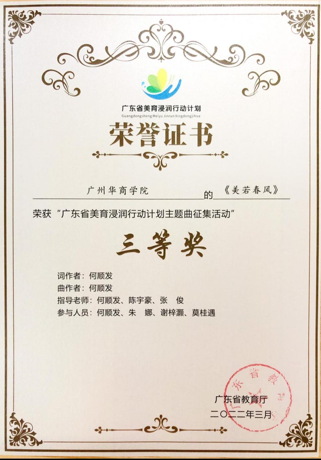 近日我们工会传来喜讯,外国语学院教职工何顺发等多位老师凭借作品《美若春风》荣获“广东省美育浸润行动计划主题曲征集活动”三等奖。