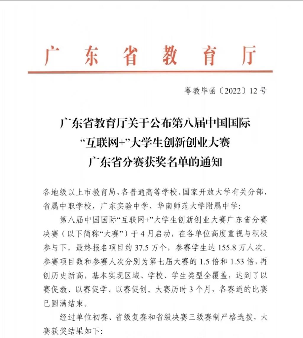 近日,第八届中国国际“互联网+”大学生创新创业大赛广东省分赛(粤教毕函【2022】12号)获奖名单公布,我们《稚影传媒—融媒体世界领跑者》和《中健领航--多维度智慧校园综合解决方案》两个项目获省赛铜奖。
