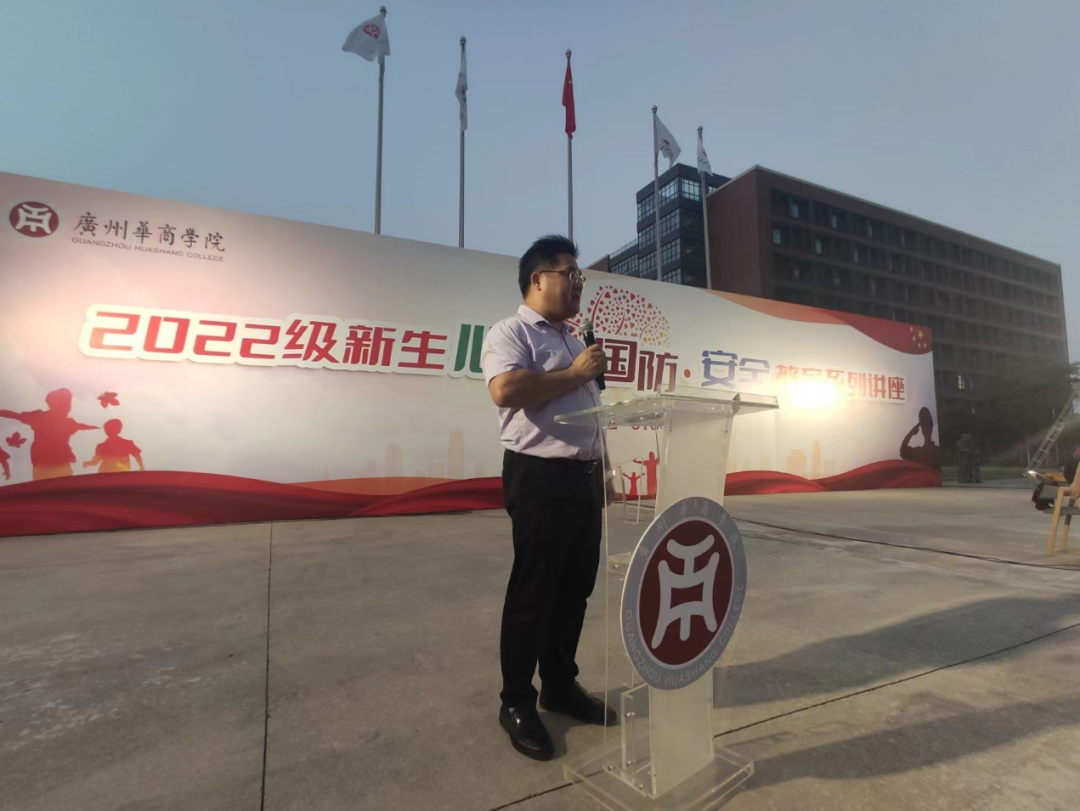 “国无防不立,民无防不安”,正值军训期间,为了加强同学们对国家安全形势的认识,提升国防安全意识,激发同学们的家国情怀和使命感,我们于9月16日在四会校区国旗广场下开展2022级新生国防安全教育讲座。本次讲座,我们邀请了空军驻广州军代局政委强以文大校作为主讲人,本次讲座由学校武装部部长、学生处副处长黄国富主持。