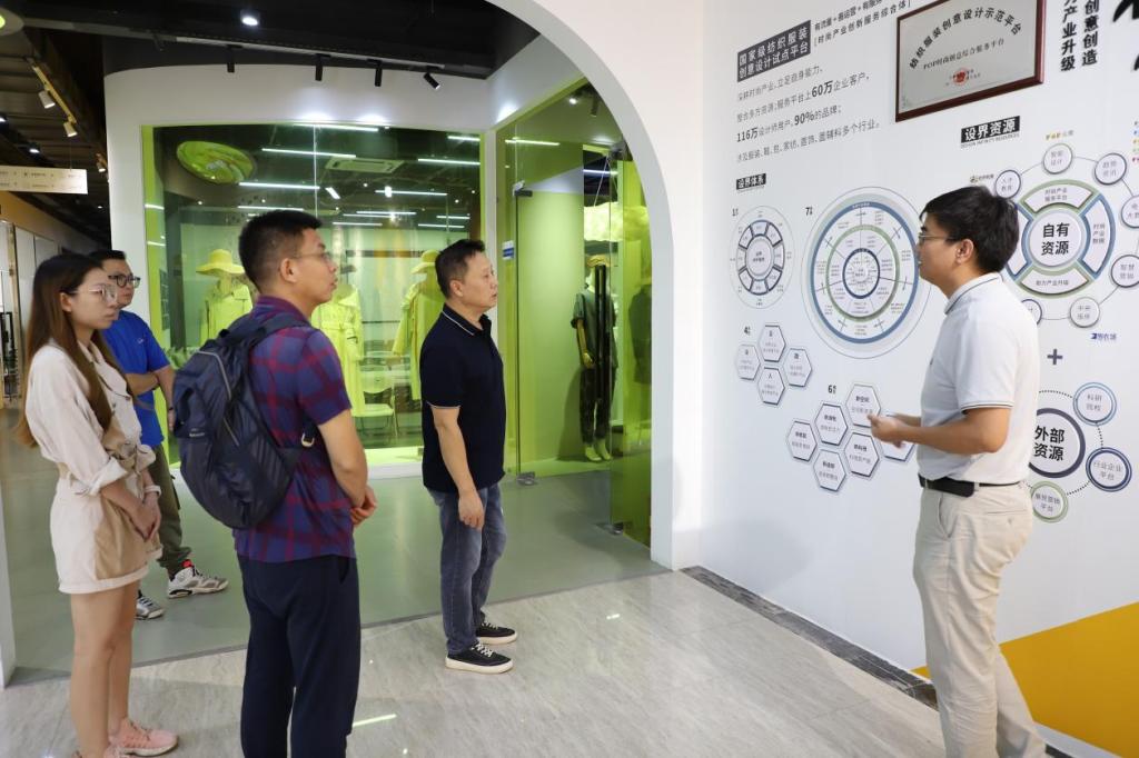 设界科技集团大湾区总经理冯永强陪同彭秀东教授一行参观设界展厅。他表示,设界作为广东省全域产业创新研究院合作单位之一,也在积极推进企业数字化转型。据他介绍,时尚趋势赋能纺织行业数字化转型升级,设界时尚产业创新服务综合体依托POP趋势、时创教育、优料宝、YIWAY新品制造局、全国各地产业地设界五大时尚产业平台,打造以“趋势+面料+设计+培训+展贸+数据”为服务体系内容的大数据数字时尚产业服务综合体,致力于为纺织行业提供时尚产业孵化配套综合服务。