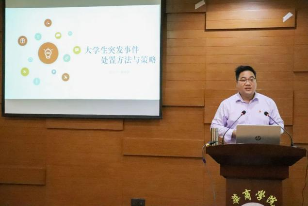 黄国富副处长带领全体辅导员进行培训。黄国富副处长为辅导员讲解突发事件处理和应对,培训地震、消防、暴恐等项目避险和疏散知识。他简述了大学生可能会遇上的突发事件,对突发事件应急处理进行了简单叙述并列举了相应的处理策略,对突发事件的案例进行简要分析。