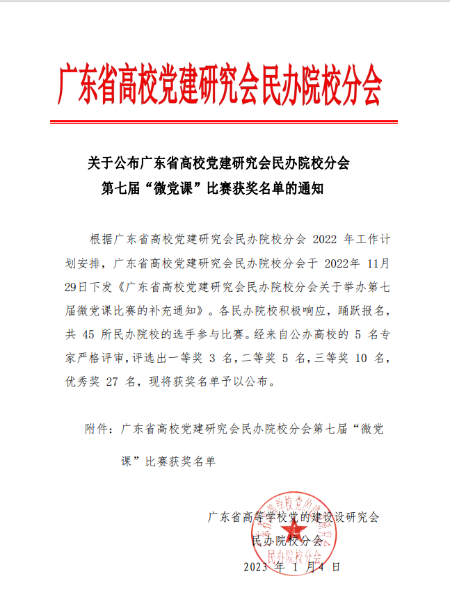 据悉,第七届“微党课”比赛由广东省高校党建研究会民办院校分会主办,各民办院校积极响应,踊跃报名,共45所民办院校的选手参赛,经专家评审,评选出一等奖3名,二等奖5名,三等奖10名,优秀奖27名。