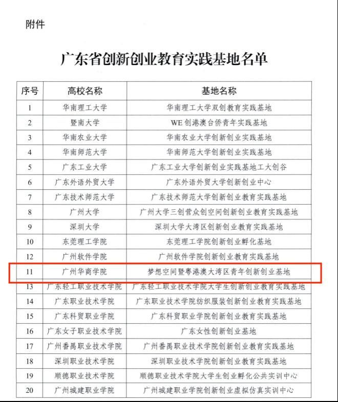 在全面深化创新创业教育改革过程中,学校注重学生实践能力培养,大力推进创新创业实践基地建设,依托广东华商众创孵化器有限公司运营华商大学科技园、梦想空间-粤港澳大湾区青年创新创业基地、华商众创孵化基地。2022年7月,梦想空间-粤港澳大湾区青年创新创业基地获批广东省创新创业教育实践基地,全省共有20个基地获批省级创新创业教育实践基地,其中民办高校仅有两所学校。