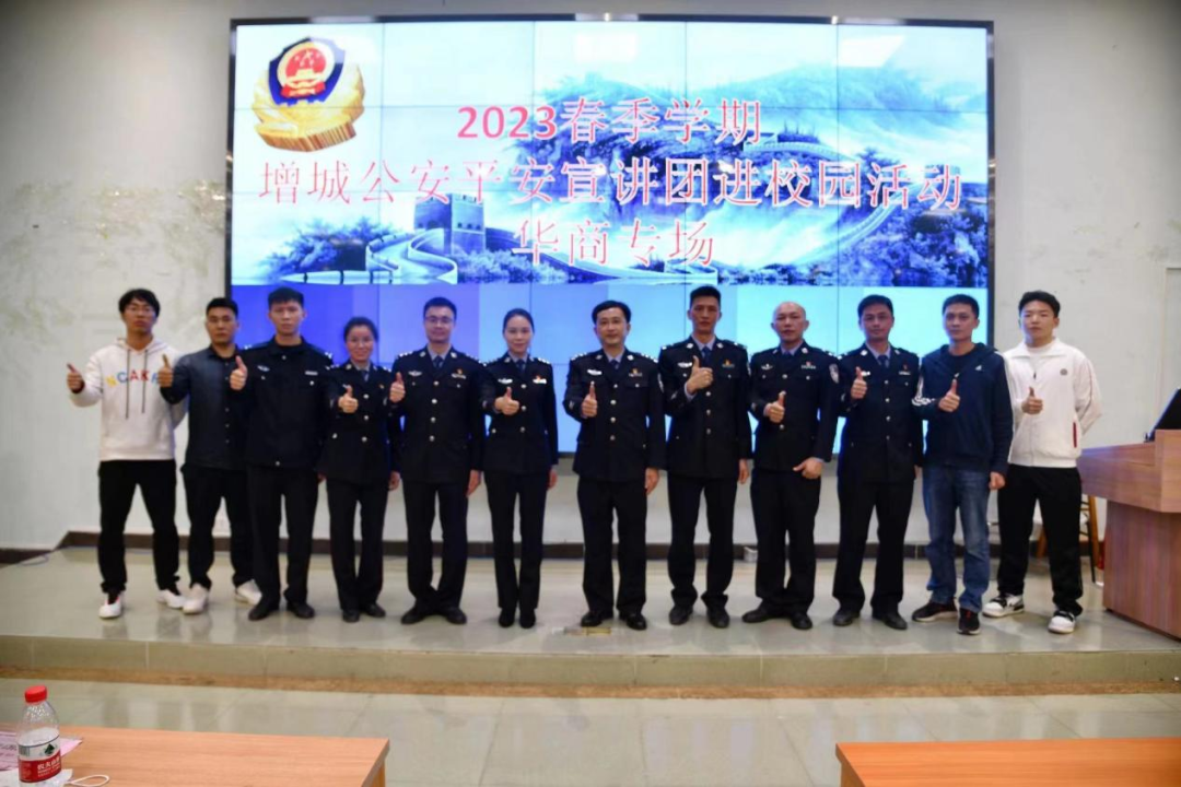 二月已破三月来,平安逢春进华商。2月28日晚,增城区公安分局在我们组织召开2023年春季学期增城公安平安宣讲团进校园活动(华商专场)。活动通过“视频直播,线下活动”的方式,现场设置了一个主会场,近200个分会场,让近两万华商学子在课堂同上 “开学安全第一课”。雁塔派出所郭璀所长、禁毒大队邓丽滨副大队长、雁塔派出所刘齐心副所长、华商学院校园服务中心邱作成副总监、后勤保卫办公室梁艳老师以及区公安分局网警大队、刑警大队、禁毒大队、交警大队的民警出席了本次活动。