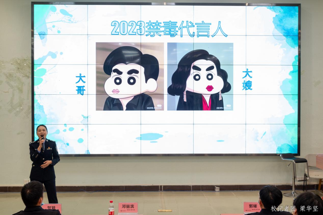 增城区分局禁毒大队邓丽滨副大队长通过播放近期热门的反黑刑侦剧 “狂飙”关于彩色麻古而吵的片段活跃现场气氛,用一个个贴切的例子着重给大家介绍了“新型毒品”种类、毒品的危害以及对社会造成的影响。邓警官强调“吸毒一口,落入虎口”,吸食毒品是严重的违法犯罪行为。同时提醒广大学生: