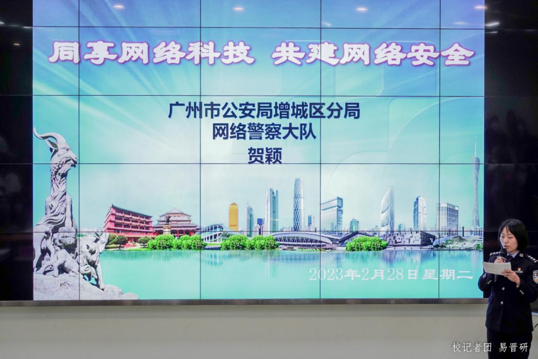 增城区分局刑警大队董悦秀警官以“进群喝奶茶”、“进群交朋友”的方式进入主题,活跃现场。通过典型的现实案例和跌宕起伏的视频讲解了兼职刷单、冒充客服、杀猪盘诈骗、网络交友四种网络诈骗形式,让学生深刻认识到电信诈骗的危害,掌握了常见的电信诈骗的类型特点、手段方式及应对处理方式。同时提醒各位同学: