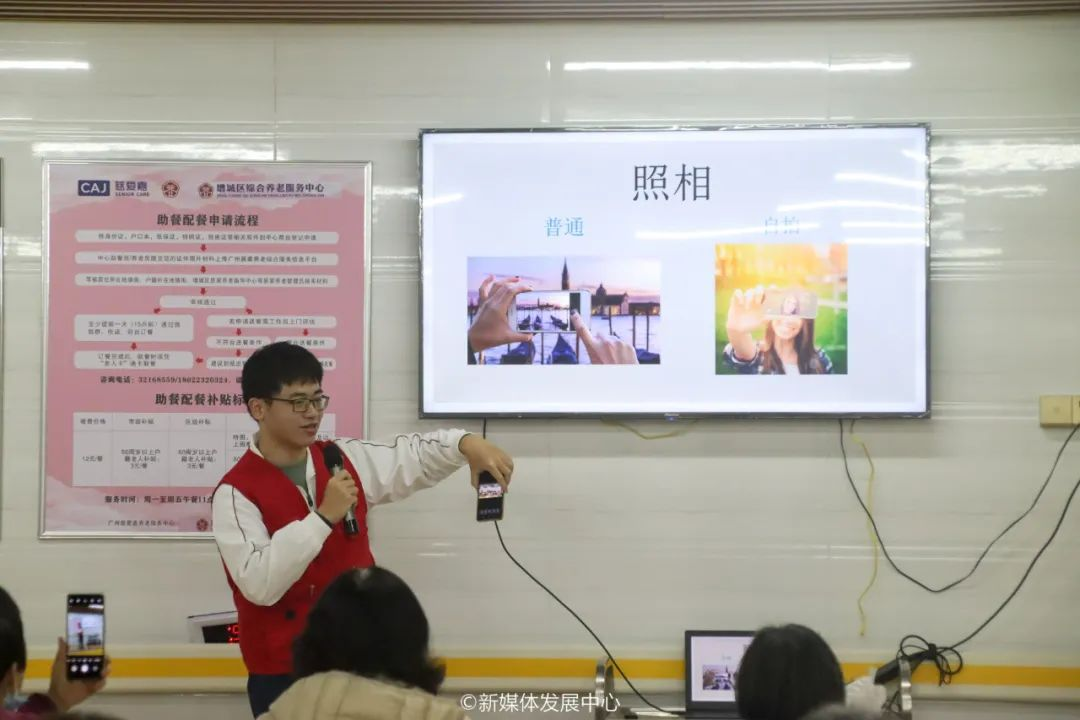 ——手机班。增城养老服务中心的手机班从理论到实操,带领长者进一步了解手机的使用和操作,跟上信息时代的节奏。主要授课内容为:认识手机按键功能、下载手机软件以及如何预防诈骗。授课方式为多媒体讲授和“一对一”指导相结合,实现教学上的互动,让长者更有参与感。课程后还设置了答疑环节,志愿者帮助长者解决一些平时困惑的问题。荔城街颐康中心的手机班首先从手机的基础使用入手,教会长者基本的操作。接着带领长者下载“抖音”app,帮助他们注册,同时教会他们如何通过抖音记录自己的美好生活。最后是网络反诈的教学,提问现场的长者是否了解国家反诈app,并且给长者科普相关骗局。课程结束前针对不同的手机系统、型号给现场长者解答课程的疑问。