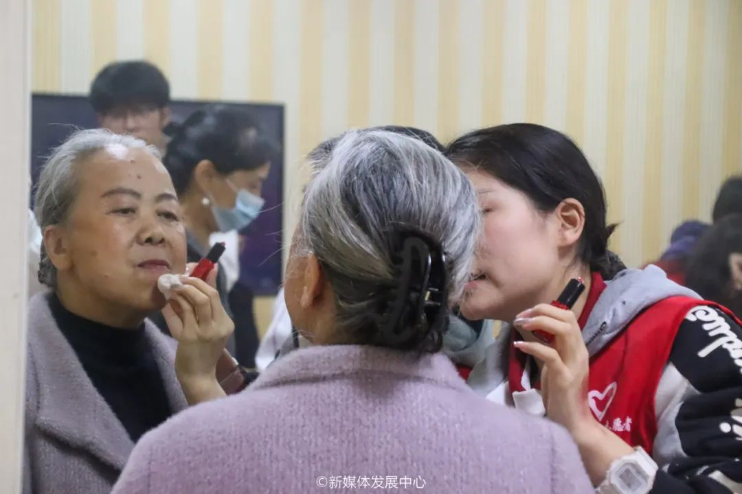 ——化妆班。增城区综合养老服务中心的化妆班采用视频+实操的形式,向长者们讲解了化妆的作用、效果以及化妆品的分类,教长者辨识和使用一些常用的化妆品。实操过程中,主要以展示化妆步骤、技巧以及如何保养皮肤为主要内容。最后,志愿者们也帮助长者们为自己化上合适的妆容。