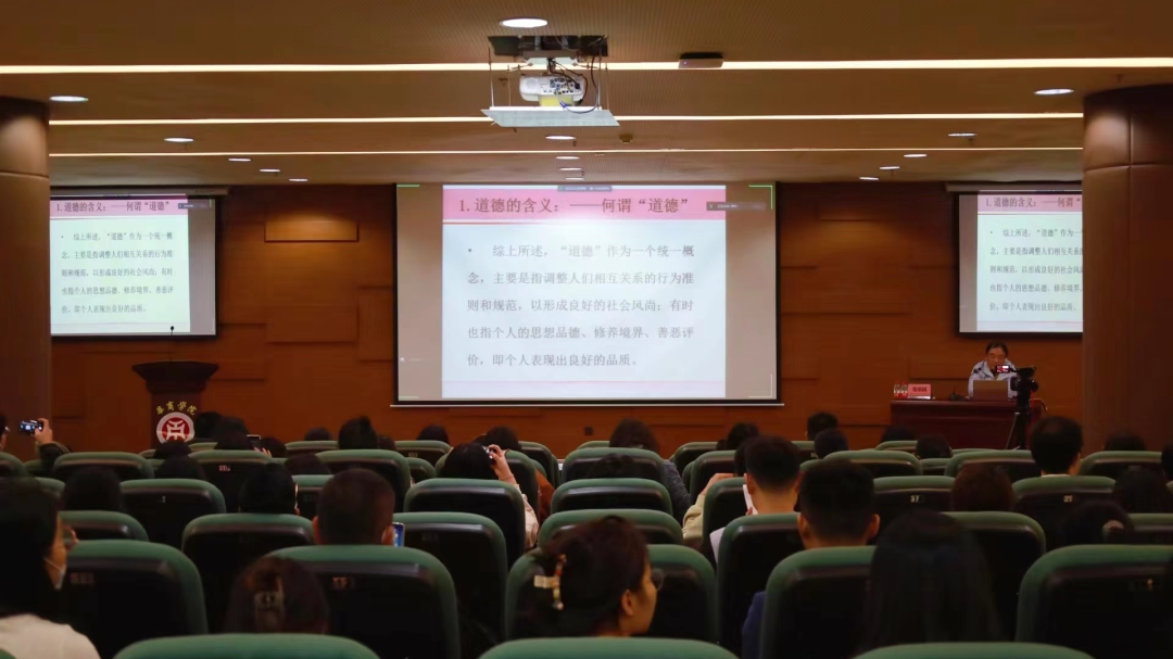 张荣国教授以道德为主题,从起源和含义开始引导各位老师进行思考,从中国传统哲学主体和西方系统的伦理道德进行分析,以多种举例分析引至道德的特点与作用,启发各位老师为人师表时要以道德为本,总结出教师职业与道德之间的联系,对教师职业道德进行全面解读,提出五个方面:坚持全心全意为人民服务的人生价值观、正确处理个人与社会的关系、把集体利益放在首位、正确处理个人与他人的关系、正确处理贡献与索取的关系。