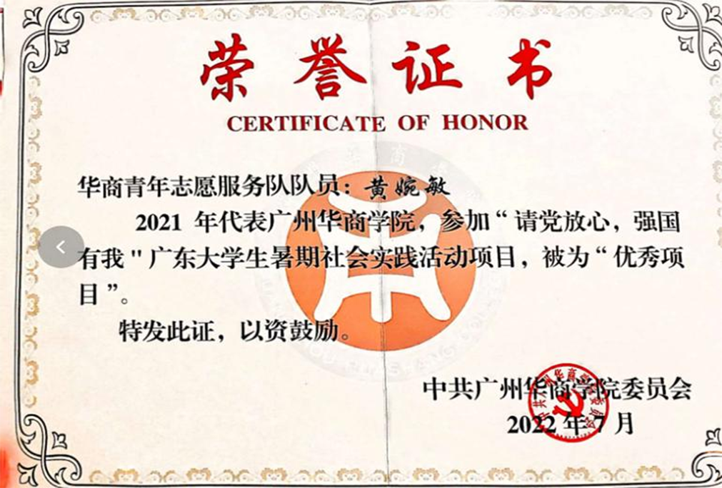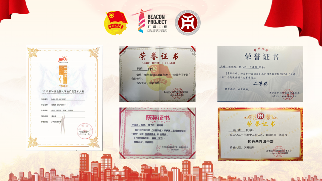 坚持不懈,收获硕果累累。周婧同学积极参加校内外多项竞赛,锻炼各方面能力素质。曾获福州外国语学校“优秀共青团员”、2022广东省大学生科技创新专项资金哲学社会科学调查报告与学术论文类立项项目、第十四届全国大学生广告艺术大赛三等奖、第十五届大学生科技学术季活动之广东大学生社会治理调研大赛三等奖、新伟德国际1946“十佳共青团干部”、新伟德国际1946“优秀生”一等奖学金等。