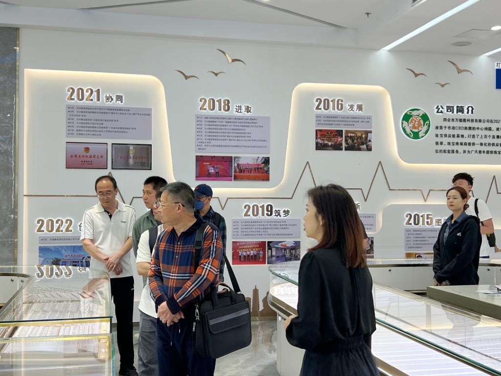 上午十点,李广明院长一行走访四会市万德隆珠宝公司。万兴隆翡翠城党委副书记吴丽丽简要介绍了四会市珠宝玉器行业、万兴隆翡翠城的发展历程和万兴隆翡翠城首创的“产业带+”的模式在电商直播产业对销售升级转型后的全貌、项目的全新定位和未来的运营方向。
