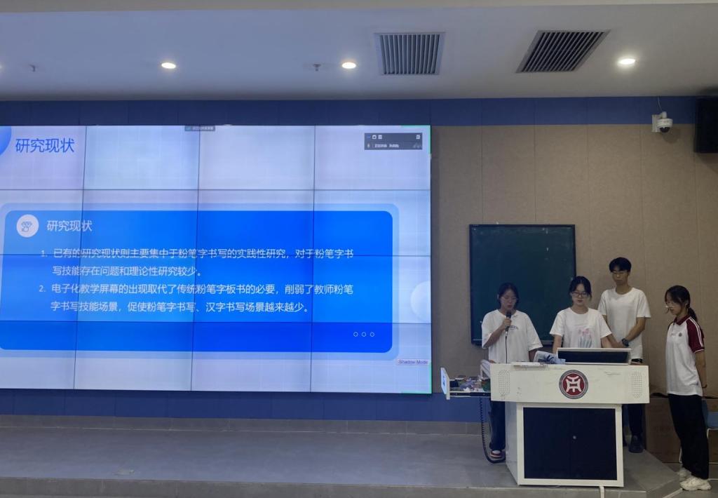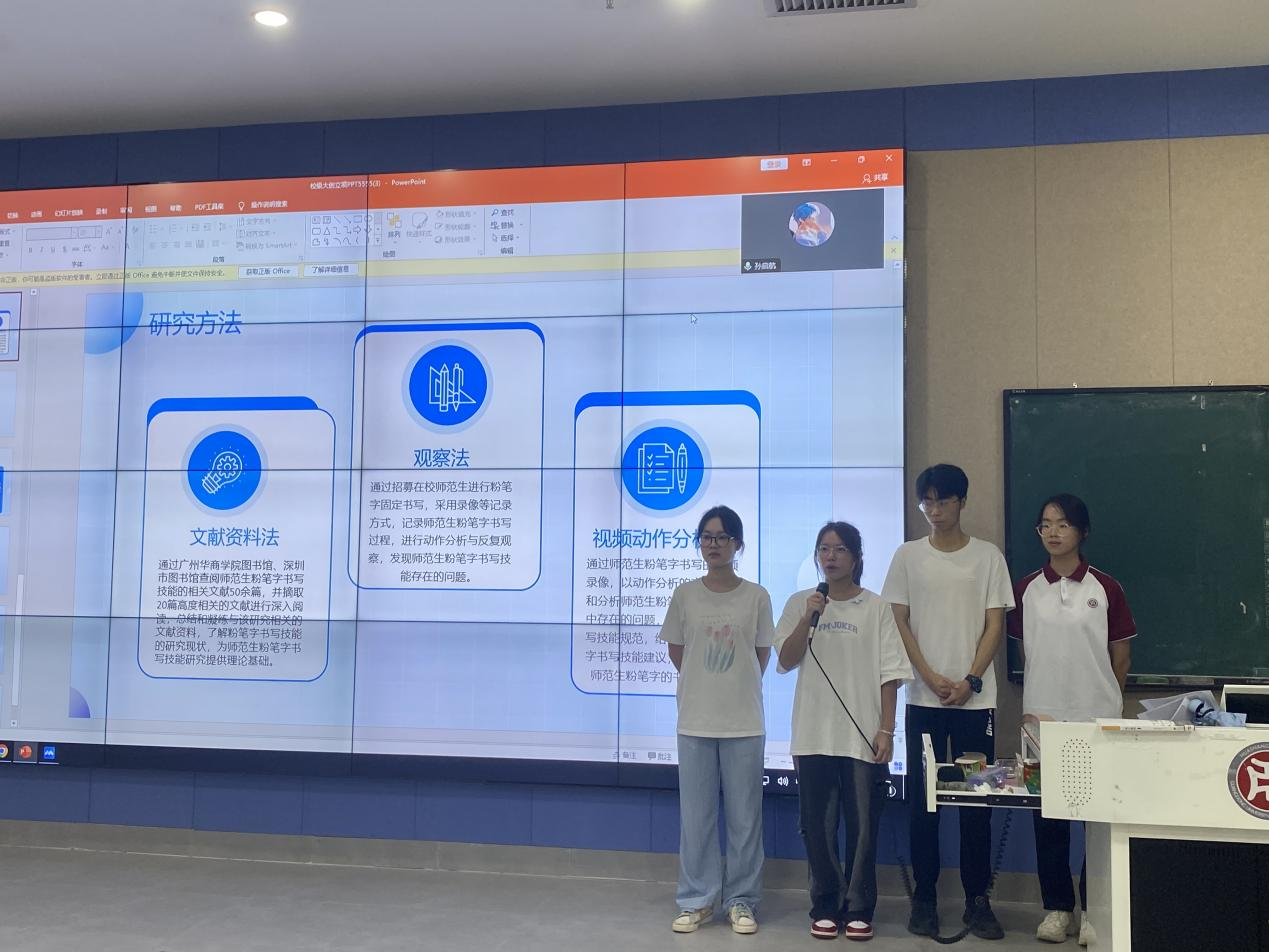 由项目负责人叶美琪同学进行项目汇报。项目成员针对师范生所面临的书写技能的不重视问题,提出此次项目答辩的研究目的及意义,并深刻阐述了选题内容、研究视角、研究思路三大创新点。