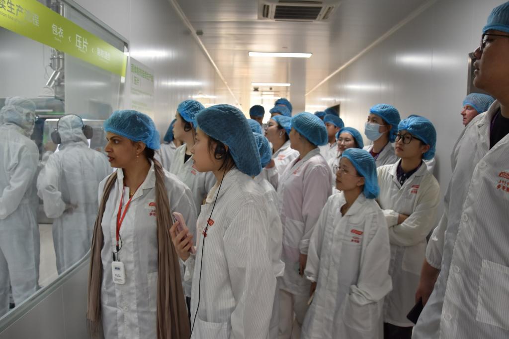 参访师生穿上防尘装备进入透明工厂的生产车间,深入了解口服固体片剂大规模连续生产和蛋白粉灌装无菌化连续生产过程。对于工厂的无尘生产环境、无人全自动设备的普及、精准的质量和数量控制,师生们不禁感叹新质生产力对工业的影响之巨大。