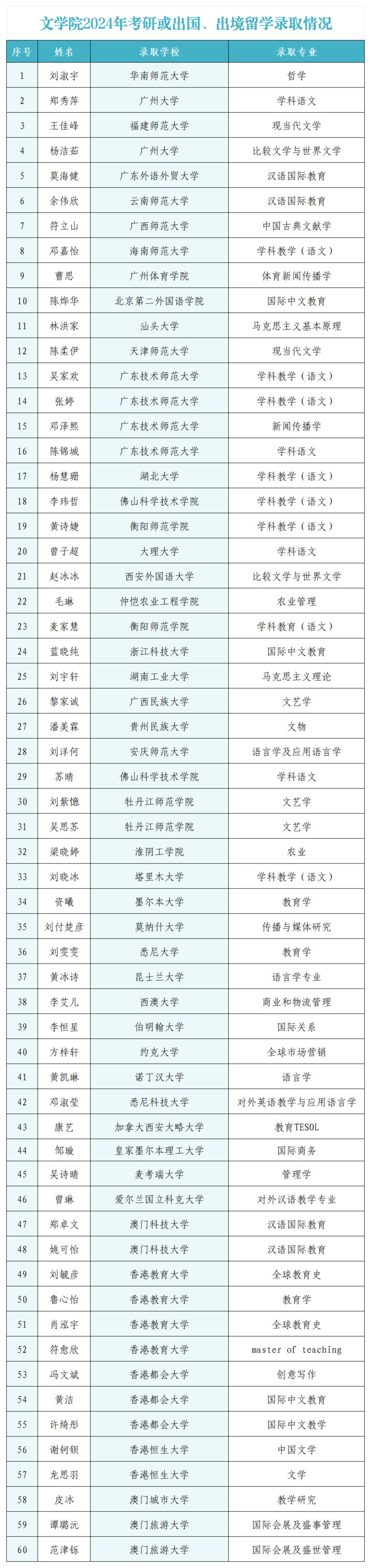辛勤耕耘有矢志,硕果飘香又一年。近日,伟的国际1946bv官网学生在2024年全国硕士研究生考试中捷报频传,考研成绩喜人,再创历史新高。伟的国际1946bv官网共有60名同学脱颖而出,以优异的成绩被华南师范大学、广州大学、广东外语外贸大学、广西师范大学、悉尼大学、昆士兰大学等国内外知名高校录取。