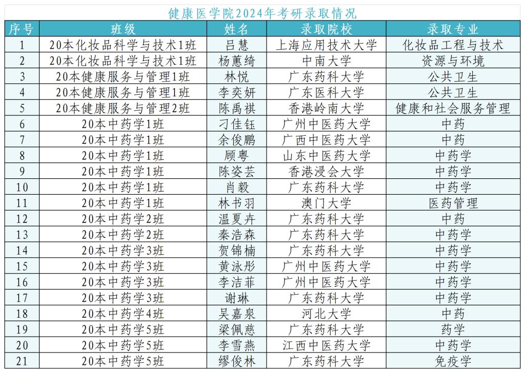 2024届,健康医学院共有272名毕业生,不少毕业生踏上“研”途,一路披荆斩棘。其中,21名健康医学子以优异的成绩被中南大学、澳门大学、广州中医药大学、广东药科大学、广西中医药大学、山东中医药大学、香港浸会大学、河北大学、江西中医药大学、上海应用技术大学、香港岭南大学等高校录取。截至到目前,考研录取率为7.72%。